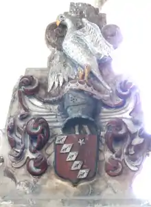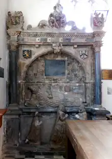 He died in 1635 and was buried in St. Andrew's Chapel (the "Cannons' Vestry") in Exeter Cathedral, as was also his wife when she died on 20 June 1636.[22] His elaborate monument with semi-recumbent alabaster effigy survives on the south side of the chancel in Bovey Tracey Church, opposite that of Nicholas Eveleigh, his second wife's first husband.