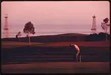 The South Ellwood Offshore field is entirely beneath the Pacific Ocean, about two miles (3.2 km) from the main onshore oil field. It is entirely within the State Tidelands zone, which encompasses areas within three nautical miles (5.6 km) of shore. These regions are subject to state, rather than Federal regulation. The last production from this field was from Platform Holly, which is in 211 feet (64 m) of water, about two miles (3.2 km) from the coast at Coal Oil Point and has been shut down.[4] Numerous directionally-drilled oil wells originate at the platform, and several pipelines connect the platform to an onshore oil processing facility adjacent to the Sandpiper Golf Course.[5]