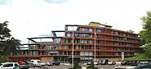 The furnishings of the former German chancery were sold at auction by the U.S. government in 1948, fetching slightly less than $50,000.[17] The chancery was auctioned by the U.S. government in 1951. Morris Cafritz was the high bidder, however, the government subsequently rejected his bid as too low.[18][19] It was thereafter sold by the U.S. government to James S. Kerwin for $165,000. United States Senator William Langer opposed the sale, saying the site should be held in trust by the U.S. government for the future use of Germany.[20] Four years later, the property was razed and turned into a parking garage.[21] In 1955 the United States established diplomatic relations with West Germany. The United States awarded the Federal Republic of Germany $300,000 from the earlier sale of the chancery and its furnishings, and a new chancery was occupied in Foxhall that year. The facility was constructed in a modern style and featured modern interior decor as, according to German diplomats at the time, the country "has no antiques now".[22][2][23]