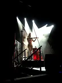 For her live performances, which she calls dinner theatre because of her practice of throwing tea and tea-time snacks off of the stage, Autumn makes use of burlesque—"a show that was mainly using humour and sexuality to make a mockery of things that were going on socially and politically"[77]—to counterbalance the more morbid topics discussed in her music, such as abuse, suicide and self-mutilation.[3] Her shows feature handmade costumes,[77] fire tricks, theatrics, and her all-female backing band, The Bloody Crumpets, a group whose members have variously included burlesque performer Veronica Varlow as The Naughty Veronica, performance artist Maggie Lally as Captain Maggot, Jill Evyn as Lady Amalthea (or Moth), actress and performer Beth Hinderliter as The Blessed Contessa, actress Aprella Godfrey Barule as Lady Aprella, German musician Lucina as Little Lucina, cellist Sarah Kim as Lady Joo Hee, German costume designer Vecona as Captain Vecona, Jesselynn Desmond as Little Miss Sugarless, and Ulorin Vex. Her intention is for the live shows to be a statement of "anti-repression" and empowerment.[29]