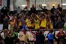 A new Emley club was established in 2005 joined Division One of the West Yorkshire League for the 2005–06 season.[5] After finishing third in their first season, they were promoted to Division One of the Northern Counties East League.[5] In 2014 the club rejected a merger with the Wakefield club.[6] In 2015–16 they finished fourth in Division One, qualifying for the promotion play-offs. After beating Penistone Church 1–0 in the semi-finals, they lost 4–3 on penalties to Bottesford Town in the final after a 1–1 draw. Striker Ashley Flynn finished the season with 73 goals, a league record.[7] In 2016–17 the club finished third, missing out on automatic promotion on goal difference; they went on to lose 3–1 to Penistone Church in the play-off semi-finals.