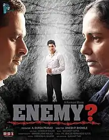 Enemy? is a 2015 Indian mystery film produced by A. Durga Prasad and directed by Dinesh P. Bhonsle who has previously directed Hindi-movie Calapor.[1] The music was composed by Schubert Cotta. The film won the Best Konkani film Award in 63rd National Film Awards, Vigyan Bhawan New Delhi.[2] It was officially selected to be screen at the 21st Kolkata International Film Festival 2015, Goa Marathi Film Festival 2016 and London Indian Film Festival 2016.[3][4] Enemy was selected for the Indiwood Panorama Competition section at the 2nd edition of Indiwood Carnival 2016 in Hyderabad.[5]