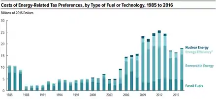According to Congressional Budget Office testimony in 2016, an estimated $10.9 billion in tax preferences was directed toward renewable energy, $4.6 billion went to fossil fuels, and $2.7 billion went to energy efficiency or electricity transmission.[1]