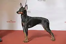 According to the Kennel Club (UK), the English Toy Terrier (Black & Tan) should be 25–30 cm (10–12 in) in height and 2.7–3.6 kg (6–8 lb) in weight. The only permitted color is black with defined tan markings on the legs, chest, and face. The movement is described as being like the extended trot of a horse.[1] The English Toy Terrier (Black & Tan) has almond-shaped eyes and 'candle-flame' ears.