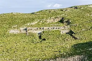 In the eastern valley are imposing remains of public buildings: a temple without peristasis (oikos) with an internal altar from the first decades of the 5th century BC, and a granary built at the end of the 4th century and destroyed by a fire in the middle of the 3rd century BC. These two buildings were aligned along the eastern side of the agora.