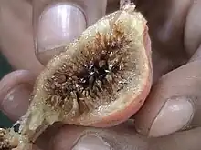 Figs in the genus Ficus have a mutualistic arrangement with certain tiny agaonid wasps. In the common fig, the inflorescence is a syconium, formed by an enlarged, fleshy, hollow receptacle with multiple ovaries on the inner surface. A female wasp enters through a narrow aperture, fertilizes these pistillate flowers, and lays its eggs in some ovaries, with galls being formed by the developing larvae. In due course, staminate flowers develop inside the syconium. Wingless male wasps hatch and mate with females in the galls before tunnelling their way out of the developing fruit. The winged females, now laden with pollen, follow, flying off to find other receptive syconia at the right stage of development. Most species of fig have their own unique commensal species of wasp.[19]