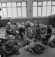 British women in World War II cutting salvaged clothes and rags for recycling.