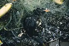 Recent research has shown that, by mass, fishing debris, such as buoys, lines, and nets, account for more than two-thirds of large plastic debris found in the oceans.[46] In the Great Pacific Garbage Patch, fishing nets alone comprise at least 46% of the debris.[47] Similarly, fishing debris has been shown to be a major source of plastic debris found on the shores of Korea.[48] Marine life interacts with debris in two ways: either through entanglement (where debris entangles or entraps animals), or ingestion of the debris (either intentionally or accidentally).[49] Both are harmful to the animal.[49] Marine debris consisting of old fishing nets or trawls can often be linked to phenomena such as ghost fishing, wherein the netting debris, referred to as ghost nets, continues to entangle and capture fish.[50] A study performed in southern Japan on octopuses noted that there was an estimated mortality rate of 212,000–505,000 octopuses per year within the area's fishing grounds, due in large part to ghost fishing.[51] Tracking garbage and monitoring the logistics of human waste disposal, especially waste materials primarily associated with fishing, is one method to reduce marine debris.[50][52] Using technological or mechanical innovations such as marine debris-clearing drones can further serve to reduce the amount of debris within oceans.[50][52]