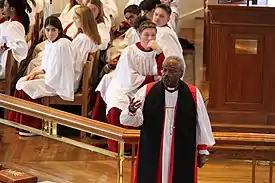 Students are required to attend a 15–20-minute chapel service two times a week and a monthly evening Vespers service. There is a voluntary church service each Sunday. Though the school is affiliated with the Episcopal Diocese of Virginia, students of all religions are welcomed and Episcopal strives to include traditions of all faith backgrounds in its services. The Chaplain's Office will also work with students to take them off-campus to attend various houses of worship in the area if they are interested, including other churches, synagogues, and mosques. Through its programs, Episcopal has brought to campus a number of notable leaders in spiritual life including Archbishop Desmond Tutu,[15] the Most Rev. Michael Curry,[16] Katherine Hayhoe,[17] and David Zahl.[18]