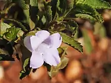 Eremophila canaliculata is a flowering plant in the figwort family, Scrophulariaceae and is endemic to an area near Newman in the Pilbara region of Western Australia. It is a low, compact and highly aromatic shrub with serrated leaves and mauve to blue flowers.