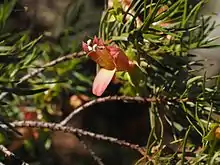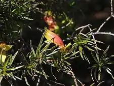The flowers are borne singly in leaf axils on a hairy stalk which is usually 10–20 mm (0.4–0.8 in) long. There are 5 sticky, overlapping, glabrous sepals which are mostly 10–15 mm (0.4–0.6 in) long but which enlarge to 15–20 mm (0.6–0.8 in) after flowering. The petals are 25–35 mm (0.98–1.4 in) long and are joined at their lower end to form a tube. The tube is bright red to orange-red on the top and yellow below and inside the tube. The outside of the petal tube usually has scattered hairs but the inside surface of the lobes is glabrous while there are some long hairs inside the tube. The 4 stamens extend beyond the end of the petal tube. Flowering occurs between March and December and the fruits which follow are dry, ovoid to conical in shape with a pointed end and a papery covering and are 7.5–13 mm (0.3–0.5 in) long.[3][4]