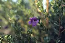 Eremophila platythamnos, commonly known as desert foxglove, is a flowering plant in the figwort family, Scrophulariaceae and is endemic to Australia. It is an erect shrub with short, broad leaves and purple, mauve, blue or pink flowers.