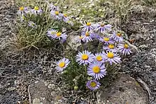 Erigeron pinnatisectus is a small perennial herb rarely more than 11 centimeters (4.4 inches) tall, producing a woody taproot. The leaves are covered with wool. The plant generally produces only 1 flower head per stem. Each head has 40–70 purple or pale blue ray florets surrounding numerous yellow disc florets. The plant grows on buffs, ledges, and steep slopes at high altitudes, often above tree line.[2][4]