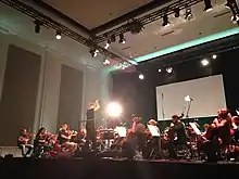 Salonen and the Philharmonia Orchestra have worked on multi-disciplinary festivals together, including Woven Words: Music begins where words end to celebrate the centenary of the birth of Witold Lutosławski, Salonen's mentor.[30] They also created the award-winning RE-RITE installation, which was first exhibited in London in 2009 and has since travelled to Portugal, China, Turkey, Germany, and Austria. The digital residency allows members of the public to conduct, play and step inside the Philharmonia Orchestra with Salonen through audio and video projections of musicians performing The Rite of Spring.[31] They followed-up with another installation, Universe of Sound, which was based on Gustav Holst's The Planets, debuted at London's Science Museum,[32] and won the 2012 Royal Philharmonic Society Award for Audiences and Engagement.[33] Salonen and the Philharmonia Orchestra, in partnership with Music Sales Group, Rite Digital, and Touch Press, released a successful iPad app, "The Orchestra". Slate called the interactive tour through orchestral history "the perfect classical music app."[34] In the autumn of 2016 the Philharmonia Orchestra launched a digital takeover of the Southbank Centre, featuring the first major virtual-reality production from a UK symphony orchestra.[35]