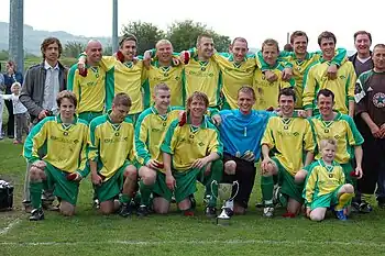 The modern club was established in 1967 as Esh Winning Pineapple.[3] They joined Division Three of the Durham and District Sunday League, and were promoted to Division Two at the end of the 1970–71 season. The club won the Guards Cup in 1971–72 and the Division Two title in 1972–73.[1] After winning the Stafferi Cup in 1974–75 and the Guards Cup again in 1975–76, they won successive league titles in 1978–79 and 1979–81.[1] In 1981 the club joined the Northern Alliance.[6] After a sixth-place finish in their first season in the league, they were promoted to Division Two of the Northern League, dropping "Pineapple" from their name.[6][7]