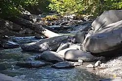 South of the Portal, what is now the "big" portion of the upper Esopus[7] turns southeast after Broadstreet Hollow Creek, with one smaller northern channel remaining closer to the road while the larger southern one bends closer to the base of Garfield Mountain, forming another one-mile portion of the Slide Mountain Wilderness boundary;[21] the two converge at a public parking lot used to put in canoes and kayaks.[27] Three miles (4.8 km) downstream, the creek turns to the south for another mile before turning east where Woodland Creek, the largest right tributary of the Esopus, flows in from the south following the east side of the former Panther crater wall, from its headwaters on Wittenberg Mountain, just east of where Woodland Valley Road crosses. Another 0.8 miles (1.3 km) in that direction, the Esopus reaches Phoenicia, the first major settlement along its course. Route 28 crosses again just west of where the stream receives Stony Clove Creek from the north, where it drains southern Greene County. The creek widens but remains shallow; the Catskill Mountain Railroad parallels its banks.[25]
