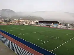 Built in 1972[6] and renovated in 2007, its playing surface is artificial grass[7] and the covered grandstand has 500 seats.[8] The athletics track is homologated for every official competition.
