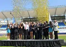 On March 20, 2013, a private inauguration ceremony was held. Former-president Sebastián Piñera cut the tape as part of the protocol.[58] The public ceremony began with a performance of the city's philharmonic orchestra, followed by a match between CDA and América de Cali. The musical group Garras de Amor performed prior to the party of Colo-Colo and Universidad Católica.[14] There was public criticism for the high price of the tickets to the opening party, and a group of councilors argued that the inaugurations of public places should be free as special moments for the city.[59] The inauguration was concluded by the percussion of the team of América de Cali, which was delayed in arriving to the city.[60]