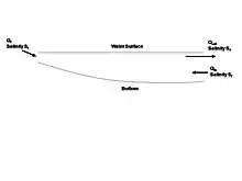 Inverse estuaries occur in dry climates where evaporation greatly exceeds the inflow of freshwater. A salinity maximum zone is formed, and both riverine and oceanic water flow close to the surface towards this zone.[7] This water is pushed downward and spreads along the bottom in both the seaward and landward direction. The maximum salinity can reach extremely high values and the residence time can be several months. In these systems, the salinity maximum zone acts like a plug, inhibiting the mixing of estuarine and oceanic waters so that freshwater does not reach the ocean. The high salinity water sinks seaward and exits the estuary.[8][9]