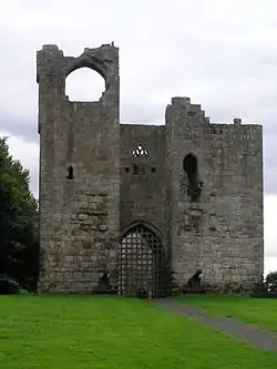 The gatehouse in the south-east corner is 36 feet (11 m) square, and its vaulted passageway was originally protected by a portcullis, gate and a drawbridge.[35] On either side of the passageway were two vaulted guardrooms, 21 feet (6.4 m) long and up to 6 feet 8 inches (2.03 m) wide.[36] On the first floor, since lost, there was a large chamber, 22 by 19 feet (6.7 by 5.8 m) wide, with an ancillary room, 7 feet 6 inches (2.29 m) square, and a doorway that led onto some form of forebuilding or platform.[37] The gatehouse has what architectural historian Anthony Emery has described as "flamboyant window tracing", and the Manners' coat of arms are carved above the entrance to the gatehouse.[38]