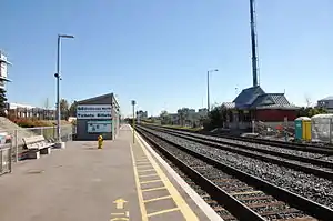 The station has 3 mainline tracks and a single platform serving only the northernmost track. A fourth track passes along the north side of the station, but it is only used for local freight access so it is fenced off from the platform.