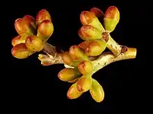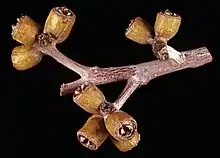 This species is also a part of the Eucalyptus subgenus Symphyomyrtus section Bisectae subsection Glandulosae because the cotyledons are bisected, the buds have a scar on the operculum and the branchlets have oil glands in the pith. Eucalyptus carnei is closely related to only one other species, E. stricklandii, and the two form the series Stricklandianae.[3]