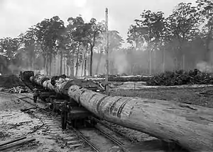 The wood has a green density of around 1,200 kilograms per cubic metre (75 lb/cu ft) with an air-dried density of about 900 kilograms per cubic metre (56 lb/cu ft).[21] The heartwood of Karri is a red colour and closely resembles Jarrah heartwood. Bushmen used to tell the two timbers apart by burning a splint of wood, Karri would leave a white ash and Jarrah would leave a grey to black coloured ash.[15] Timber from Karri is suitable for construction work. It is a little more dense than Jarrah but is much stronger. Karri wood is not a termite resistant as that of Jarrah.[15] The tree has been logged since the settlement of Western Australia with logging towns appearing throughout the range of the tree and producing hardwood timbers, mostly for construction purposes, for the first 150 years since settlement.[22] The first Karri timber to be felled for export was at the isolated population around Leeuwin, which became known as Karridale. The virtues of the wood were promoted in the 1920s by the state conservator of forests, Charles Lane-Poole, who noted the colonists' preference for other timber as its vulnerability to white ants made it a poor choice for fence posts and railway sleepers. The timber found uses in the state for wagon spokes and wooden pipes, and in England it was found suitable for scantlings by the national railway and telegraph arms by the postal services and was listed among Lloyds shipbuilding timbers as possessing great strength over large lengths.[28]