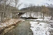 Subwatershed 2: Euclid Creek Reservation—This 10-square-mile (26 km2) area contains 6.8 miles (10.9 km) of the main branch stream and tributaries in the Euclid Creek Reservation. About 20 percent of this area is undeveloped, with 11 to 15 percent covered with impervious surfaces such as building rooftops, lawns, and parking lots. The watershed here is largely natural, and is enclosed in a deep, broad valley whose walls are mostly bedrock. Limited illegal dumping occurs in the park, and the creek's water quality is affected by polluted surface runoff from nearby residential areas after heavy storms.[lower-alpha 9] Verbsky Creek,[60][64] a roughly 1.5-mile (2.4 km) long tributary, joins the east branch just before the east branch's confluence with the main branch. It runs west of Highland Road, crossing to the east of the street about 200 feet (61 m) east of the intersection of Georgetown Road and Hilltop Road. It crosses Highland Road again and turns south between Highland Ridge Drive and Donna Drive, passing through and under residential developments. Redstone Run, a 2.65 miles (4.26 km) stream,[60][64] joins Verbsky Creek just before Verbsky Creek crosses east of Highland Road. It travels east-southeast through a heavily forested ravine bordered by housing developments before turning south north of Hillcrest Drive. Flowing through a series of culverts, tunnels, and open ditches, it crosses Highland Road just west of Karl Drive, flows southeast for about 250 feet (76 m), turns south and runs between Harris Drive and Catlin Drive for about 800 feet (240 m), then runs southeast to just north of the intersection of Jefferson Lane and Monticello Place. It then travels east to Richmond Road, where its headwaters formerly began beneath what is now Richmond Town Square mall.[53]