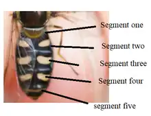 The abdominal spots are yellow, finger-like wide, curved and interrupted in the middle. The first segment is very narrow and all black. The spots on the second segment do not reach the sides. In the females, abdominal bands are broader. The fifth segment is yellow, sometimes with a small median black spot. The spots on segments three and four are very slightly lunate with the posterior margins of fourth and fifth segments narrowly yellow.[3]