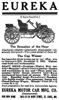 The Eureka was an American automobile made from 1907 to 1909. It was a wheel-steered high wheeler from St. Louis, Missouri, with a two-cylinder 10/12 hp air-cooled engine and conventional sliding gear transmission.