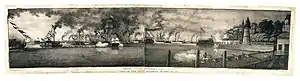 On September 21, 1776, the city suffered a devastating fire of an uncertain origin after the evacuation of Washington's Continental Army at the beginning of the occupation. With hundreds of houses destroyed, many residents had to live in makeshift housing built from old ships.[4] In addition, over 10,000 Patriot soldiers and sailors died on prison ships in New York waters (Wallabout Bay) during the occupation—more Patriots died on these ships than died in every single battle of the war, combined.[5][6][7][8][9][10][11][12][13] These men are memorialized, and many of their remains are interred, at the Prison Ship Martyrs' Monument in Fort Greene Park, Brooklyn.