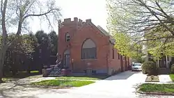 Its most salient feature is a castellated two-story tower. It has decorative brick and concrete false buttresses.[3]