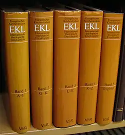 The Evangelische Kirchenlexikon (EKL) is a theological lexicon published by Vandenhoeck & Ruprecht, Göttingen. The first edition appeared in three volumes from 1955–1959,[1] and a register volume followed in 1961. The second edition was an unchanged reprint published in 1962.[2] The editors were Heinz Brunotte and Otto Weber.[3] Erwin Fahlbusch was responsible for the publication of the third, revised edition from 1986–1997 in collaboration with numerous specialist scholars.