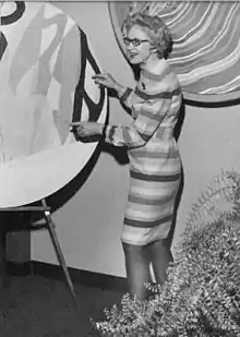 ![]() Drewelowe with one of her paintings at a Boulder Art Guild show in the 1970s | |