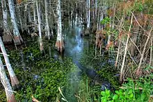 The Florida peninsula appeared above sea level between 100,000 and 150,000 years ago. As sea levels rose at the end of the Wisconsin ice age, the water table appeared closer to land. Lake Okeechobee began to flood, and convection thunderstorms were created.[13] Vast peat deposits south of Lake Okeechobee indicate that regular flooding had occurred about 5,000 years ago. Plants began to migrate, subtropical ones from the northern part of Florida, and tropicals carried as seeds by birds from islands in the Caribbean.[14] The limestone shelf appears to be flat, but there are slight rises—called pinnacles—and depressions caused by the erosion of limestone by the acidic properties of the water. The amount of time throughout the year that water is present in a location in the Everglades determines the type of soil, of which there only two in the Everglades: peat, created by many years of decomposing plant matter, and marl, the result of dried periphyton, or chunks of algae and microorganisms that create a grayish mud. Portions of the Everglades that remain flooded for more than nine months out of the year are usually covered by peat. Areas that are flooded for six months or less are covered by marl. Plant communities are determined by the type of soil and the amount of water present.[15][16]