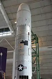 Two of the main attractions of the space flight center are a Titan II SLV satellite booster rocket and a SR-71 Blackbird.[10] The Titan II sits upright in a specially constructed display extending two stories below the floor, in order to fit the 114 foot tall rocket inside the building. The exhibit includes a re-created Titan II SLV Launch Control Room outfitted with actual furnishings and equipment donated from Vandenberg Air Force Base.