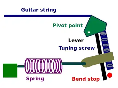 On a guitar, the bridge has six springs and levers, one for each of a guitar's six strings,[2] such that "when a string stretches or slips, the springs apply the opposing force necessary to compensate for the shift, thus maintaining the correct tension and tuning."[5] In theory, the device can work with any stringed instrument, according to the inventors.[3] The mechanism has been patented. A guitar with one installed is no longer tuned by turning the pegs at the end of the guitar's neck but rather with a screw on the bridge.[2]