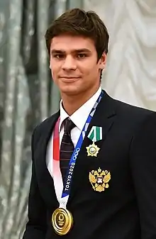 Evgeny Mikhailovich Rylov (Russian: Евгений Михайлович Рылов, IPA: [jɪvˈɡʲenʲɪj ˈrɨləf]; born 23 September 1996) is a Russian competitive swimmer and Olympic champion specializing in backstroke events. He won three gold medals at the 2014 Summer Youth Olympics in Nanjing, and a bronze medal at his senior international debut at the 2015 World Championships in Kazan.[3] He also won a bronze medal at the 2016 Summer Olympics in Rio de Janeiro and a gold medal at the 2017 World Championships in Budapest, both were in the 200 metre backstroke event. In 2018, at the 2018 World Short Course Championships, he won gold medals in the 200 metre backstroke and 50 metre backstroke. At the 2019 World Championships, he won a gold medal in the 200 metre backstroke, silver medal in the 100 metre backstroke, and silver medal in the 50 metre backstroke. He won the gold medal in the 100 metre backstroke and 200 metre backstroke at the 2020 Summer Olympics in Tokyo.[4]