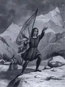 The poem describes a young man passing through a mountain village at dusk. He bears the banner "Excelsior" (translated from Latin as "higher", also loosely but more widely as "onward and upward"). The traveller disregards warnings from villagers of fearful dangers above, and an offer of rest from a local maiden. The youth climbs higher until a last distant cry interrupts the prayers of the monks of Saint Bernard. "Lifeless, but beautiful" he is found by the "faithful hound" half-buried in the snow, "still clasping in his hands of ice that banner with the strange device, Excelsior!"