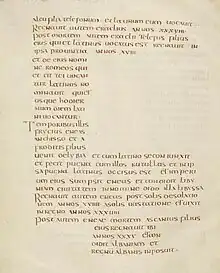The quality of the Latin translation is universally regarded as poor.[2][6][14] Comparing it with classical Latin led Scaliger to attack the translator's competence.[15] While the translation is poor even by 8th-century standards, it is much closer to the standard vulgar Latin of the day than Scaliger realized.[6][16] Earlier scholarship was uncertain whether the translator's first language was Latin or Greek, but it was probably neither. The translator's first language was either a very early form of Old French or a Germanic language. He was probably a student at Corbie without complete mastery of proper Latin and Greek.[17] It has been suggested that he may have had an association with the monastery of Cimiez.[lower-alpha 8]
