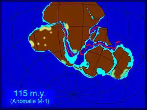 In the Late Jurassic, Gondwanaland begins to break apart creating Western Gondwana, which was composed of the South American and African continental land masses, and Eastern Gondwana. The Eastern Gondwanian continent was composed of Madagascar, Greater India, Antarctica, and Australia. During this period of time Australia shared its southern margin with Antarctica and the western margin (now the Exmouth Plateau) with Greater India.[3][4] The formation of the Exmouth's northern margin, the Argo Abyssal Plain, was not initiated until 155 million years ago when Australia broke apart from a continental fragment of the Burma plate that's present location is argued to be subsumed under Asia.[5] It wasn't until 20 million years later that the Greater Indian land mass broke from western Australia, forming the central and southern margins of the Exmouth Plateau now known as the Gascoyne and Cuvier Abyssal Plains.[4] As Australia continued to diverge away from the Antarctic land mass, it migrated in a northeastern direction and rotated counterclockwise to it present location, leaving the Exmouth Plateau along the continent's western margin.[2]