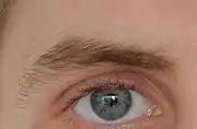 An eyebrow is an area of short hairs above each eye that follows the shape of the lower margin of the brow ridges of some mammals. In humans, eyebrows serve two main functions: first, communication through facial expression, and second, prevention of sweat, water, and other debris from falling down into the eye socket. It is common for people to modify their eyebrows by means of hair removal and makeup.