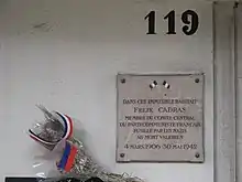 Cadras was executed by a German firing squad on 30 May 1942 at Fort Mont-Valérien, Paris, along with Arthur Dallidet, Louis Salomon and Jacques Decour. The executions were a reprisal for an attempted assassination in Le Havre on 23 May 1942.[10] Cadras was said to have been singing La Marseillaise when he was shot.[11] After the war Cadras was presented as a martyr by the Communist Party, an ideal of a young working-class militant. He was made a Chevalier of the Legion of Honor by a decree of 17 January 1961.[7] A school in Calais is named after him, and a street in Calais-Nord.[1]
