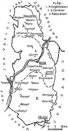 - Plasa Mihail Kogălniceanu, containing 72 villages, with its seat at Huși