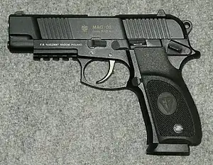 The MAG-95 is a Polish 9mm semi-automatic pistol. Originally designed by Marian Gryszkiewicz, it was manufactured at the Łucznik Arms Factory (Fabryka Broni Łucznik) in Radom. An improved model was MAG-98, and currently is MAG-08. With the MAG-95 pistol the designers abandoned their previous design practices based on the use of the 9×18mm Makarov cartridge and instead utilized a Western-influenced approach involving the 9×19mm Parabellum cartridge and some of the latest safety and other design techniques. The MAG-95 incorporates most of the user facilities to which shooters in the West have become accustomed, but which have been absent from most Eastern Bloc pistols until recently. The PR-15 Ragun pistol is development of MAG.