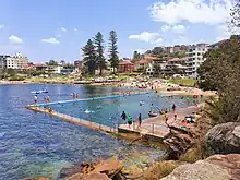 Fairlight Beach is located on the Manly Scenic Walkway[6] on Sydney Harbour, which can be followed for some kilometres to Spit Bridge. The beach experiences light harbour swells and southerly winds. Though swells up to 2 metres were recorded following Hurricane Larry, it is not a surfing beach, as the shore is rocky and the break unpredictable. The beach has sand largely made up of shell grit (largely missing from the beaches on either side), and a small tidal swimming pool.
