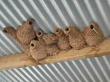 The nest is a retort or bottle shaped structure, made from up to 1,000 mud pellets and lined with dried grasses and feathers. The bowl is about 15 centimetres (5.9 in) in diameter, and the entrance tunnel is 5–30 centimetres (2.0–11.8 in) long. The nests in a colony are clustered together. Both sexes build the nest and share incubation and care of the young.