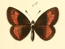 The wingspan is 18–20 mm. The ground colour is dark brown butterfly. There is an orange postdiscal band adorned with two ocelli with white pupils on the forewing. These are more or less marked according to the individuals. Adults are on wing from July to August.