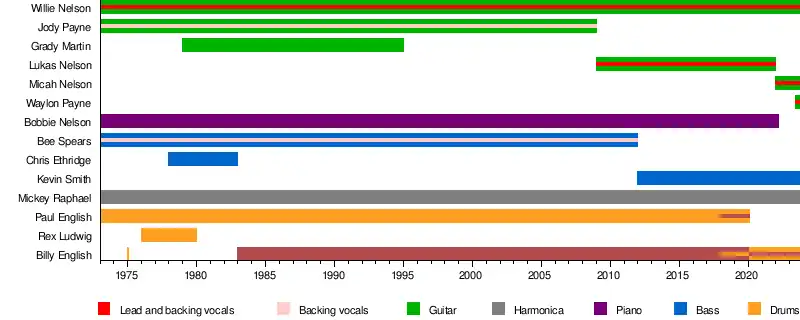 In 1973, he formed a new backing band. The new lineup consisted of some of the members of his old road band "The Record Men," with the addition of new members. The original lineup included his sister, Bobbie, on the piano; drummer Paul English; harmonicist Mickey Raphael; bassist Bee Spears; and guitarist Jody Payne. The current lineup includes all the members but Jody Payne, who retired in 2008, Bee Spears, who died in 2011, and Paul English, who died in February 2020. Billy English joined in 1983 on percussion.[1] Replacing Spears, Kevin Smith joined the band in 2012, and Willie Nelson’s son Lukas Nelson joined in 2013 replacing Payne. Bobbie Nelson died in 2022. Willie's son Micah replaced his brother Lukas in 2022, and Waylon Payne (Jody Payne's son) has filled in for Micah at some 2023 shows.