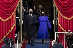 Ella Emhoff is the stepdaughter of Kamala Harris through her marriage to Doug Emhoff. She was born May 29, 1999, to Kerstin Emhoff and is named after jazz singer Ella Fitzgerald.[10] In 2014, she was in the music video for Bo Burnham's song "Repeat Stuff". In 2018, Emhoff graduated from high school in Los Angeles where she was on the swim team.[13] She is an artist majoring in apparel and textiles at Parsons School of Design. Emhoff calls Harris "Momala".[10] She designed her inauguration day dress with designer Batsheva Hay.[14][15]
